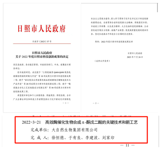近日,日照市人民政府公布2022年度日照市科技創(chuàng)新成果名單,大自然生物集團(tuán)有限公司研發(fā)的“高效酶催化生物合成α-酮戊二酸的關(guān)鍵技術(shù)和新工藝” 榮獲2022年度日照市科技創(chuàng)新成果三等獎(jiǎng)。